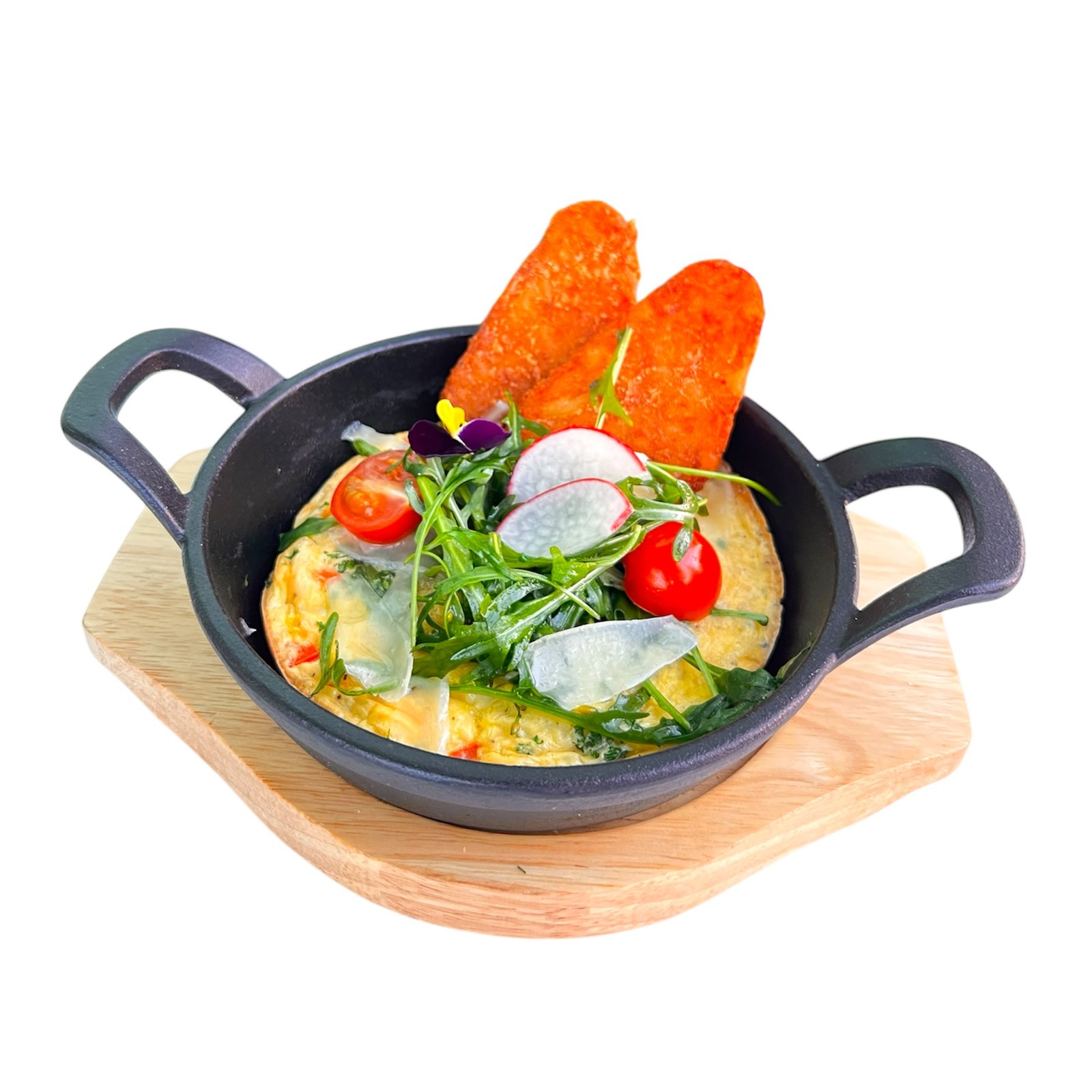 Two-egg mixed vegetable frittata, served with fresh arugula salad ,shaved Parmesan Cheese & Crispy golden hashbrowns. 480Kcal